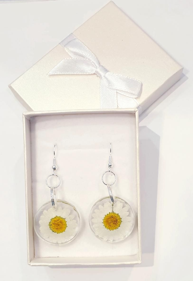 White dried flowers set in eco resin with double silver coloured rings on hallmarked 925 silver ear hooks to make these lovely summery earrings.