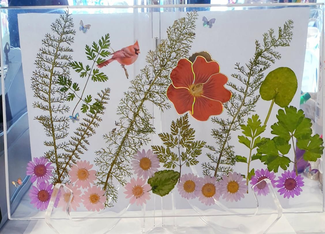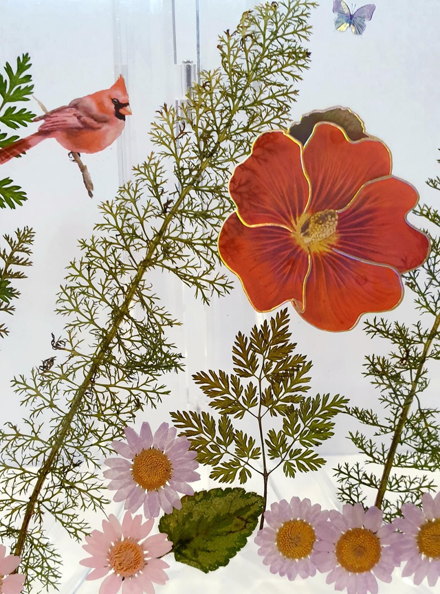 Dried flowers, leaves and bird sticker set in eco resin to make this lovely table mat.