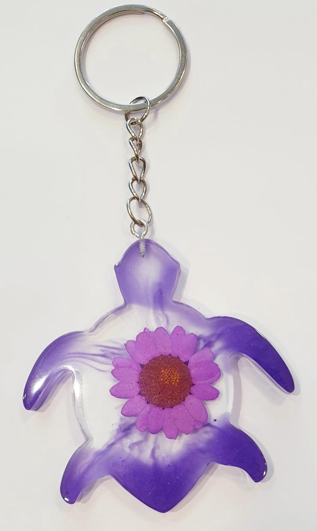 Purple dried flower with lavender mica powder set in eco resin to make this eye catching keyring.